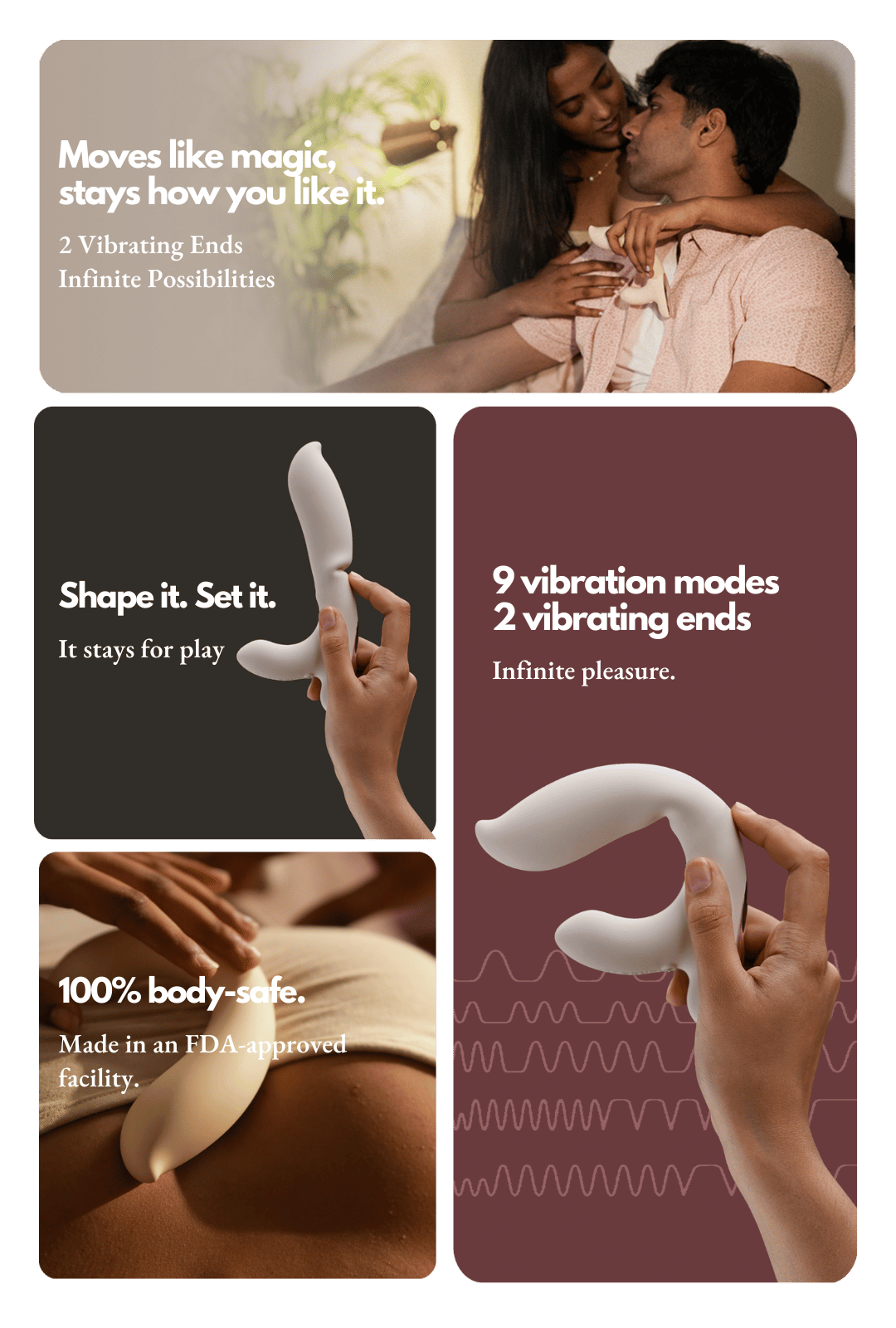 A. Arc represents the pinnacle of intimate innovation in India. Engineered with a 360° bendable design that holds your custom shape until you decide to change it, Arc offers unrivaled versatility. With dual vibrating motors that deliver synchronized, targeted stimulation from both ends and a luxurious wrap of India’s softest, body-safe silicone, Arc stands out as the most premium, high-performance massager on the market. Every detail has been meticulously designed so you can experience the ultimate in discreet, powerful pleasure.